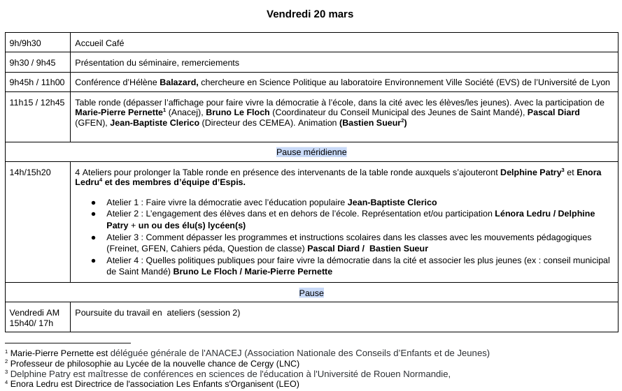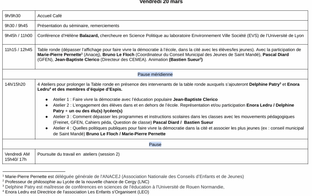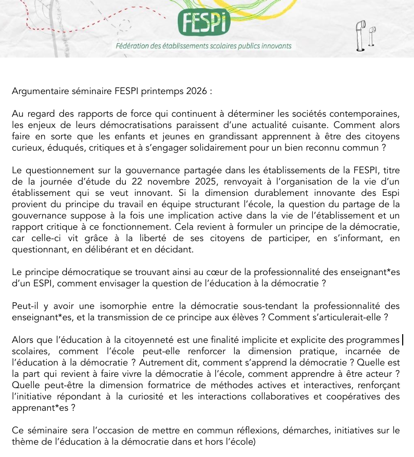 La FESPI organise son séminaire de printemps, les 20 et 21 mars 2026 sur le site universitaire de Gennevilliers. On y abordera de façon très large, la question de l’éducation à la démocratie. L’argumentaire qui suit définit le cadre de travail et de rencontres de ces deux journées.
